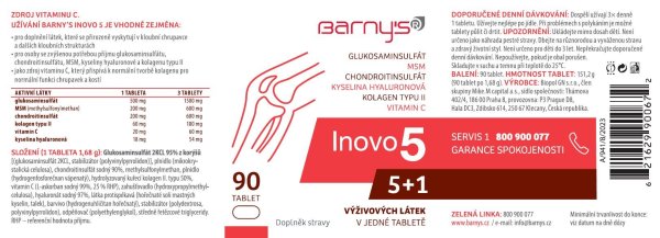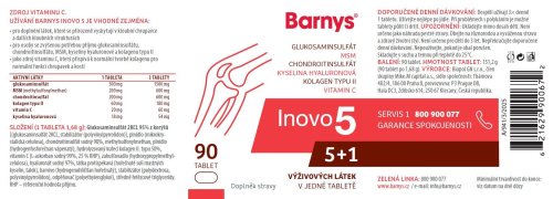 Unikátní složení doplňku stravy Barny's Inovo 5 je výjimečné tím, že obsahuje důležité látky, které se v kloubech, pojivových tkáních anebo v chrupavce běžně vyskytují. Nejlépe hodnocený v nezávislém testu kloubní výživy dTest 5/2016.