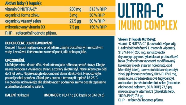 Doplněk stravy ULTRA-C IMUNO COMPLEX obsahuje kombinaci vitaminů C a D v bioaktivní formě. Dále obsahuje organické formy minerálů (zinek, selen) v dostatečném množství pro podporu a posílení imunity.