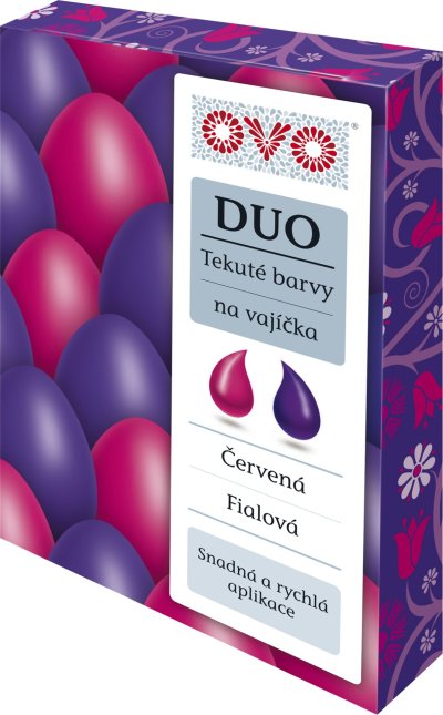 Tekutá barva na velikonoční vajíčka. V balení je červená a fialová barva, každá v pytlíčku po 20 ml.