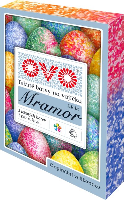 Sada tekutých barev s efektem mramoru pro nazdobení velikonočních vajíček. Balení obsahuje 5 gelových barev ve složení žlutá, červená, modrá, zelená, oranžová + jeden pár rukavic ke snadnější a čistší aplikaci barevného mramorovaného efektu.