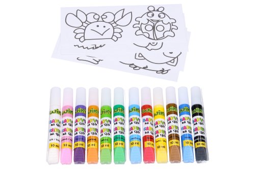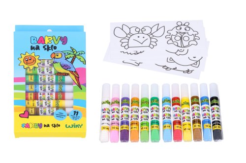 Barvy na sklo 11+1 10 ml Obsahuje: 11 barev (bílá, růžová, fialová, oranžová, telená, tmavě zelená, světle modrá, červená, žlutá, hnědá, modrá) 10 ml + kontura černá 10ml + 2 fólie + šablonové obrázky