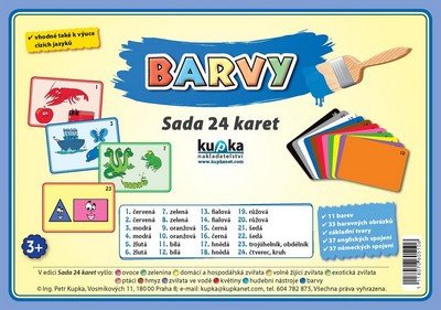 Laminované karty s 11 základními barvami příjemnou formou pomáhají při výuce rozeznávání barev. Karty jsou určené dětem od 3 let. Mohou být využity při práci s dětmi v mateřských školách, v mateřských centrech nebo v domácím prostředí. Jsou vhodné také k výuce cizích jazyků. Sada obsahuje 24 karet velikosti 10x7 cm (4 obrázky na kartě určené k rozstříhání).