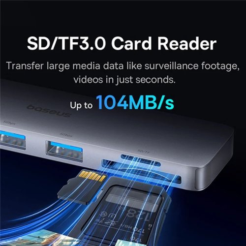 *40Gbps Hyper-Fast Transfer *Magnetický design - S magnetickou nálepkou pro bezpečnější připojení bez poškození původního portu nebo blokování nabíjecího portu *8,3 mm ultratenké tělo – Miniaturní a kompaktní design, který se hodí přímo k vašemu notebooku a snadno se přenáší a skladuje *Čtečky karet/ Rychlé čtení – Rychlost až 104 MB/s, přenos velkých mediálních dat během několika sekund *PD 100W Fast Charging - Rychlé nabíjení *Vynikající kontrola teploty - BCT (Baseus Cooling Tech) pomáhá odvodu tepla pro stabilnější provoz při plné zátěži bez přehřívání