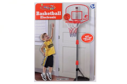 Basketbalový koš s počítadlem, světlem a zvuky fandění. Napájení na 3xAAA baterie - nejsou součástí balení. Rozměry koše se stojanem 97-170 cm výška, 43 cm šířka. Baleno v krabici. Rozměry balení 38x49x11,5 cm. Věk 3+