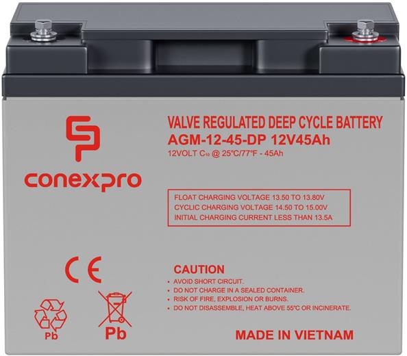 Baterie Conexpro AGM-12-45-DP poskytuje stabilní napájení pro menší zařízení s cyklickým provozem, jako jsou solární systémy, karavany, záložní zdroje UPS, bezpečnostní technologie nebo IT infrastruktura. Díky technologii Absorbent Glass Mat (AGM) je elektrolyt bezpečně vázán v porézní struktuře ze skelných vláken, což zajišťuje vysokou odolnost vůči opakovanému vybíjení a bezproblémový provoz bez nutnosti údržby. Baterie je vybavena M6 konektory pro jednoduché a bezpečné připojení. Nízké samovybíjení zajišťuje připravenost k použití i po delší době nečinnosti.