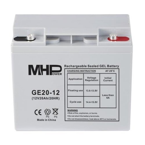 Gelový akumulátor MHPower GE20-12 přináší výhody pokročilé gelové technologie – nízké samovybíjení, vysokou životnost a odolnost vůči hlubokému vybíjení. Speciální separátory a silikagel imobilizující elektrolyt prodlužují provozní spolehlivost, a to i v širokém teplotním rozsahu. Baterie je ideální pro UPS jednotky, fotovoltaické instalace, EPS a EZS zařízení, telekomunikační techniku nebo zálohování čerpadel a kotlů. Odolné ABS pouzdro a technologie tepelného těsnění zajišťují mechanickou stabilitu a bezpečný provoz.
