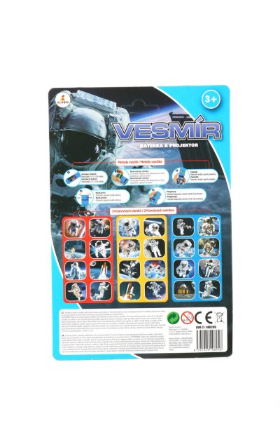 Vydej se na dobrodružnou cestu vesmírem s touto baterkou a projektorem v jednom! Promítej 24 barevných obrázků planet, hvězd a raket a vyprávěj fascinující příběhy o vesmírných objevech. Výrobek je vybaven světelným efektem, který dodává promítání magickou atmosféru. Perfektní hračka pro malé astronauty a milovníky vesmíru!
