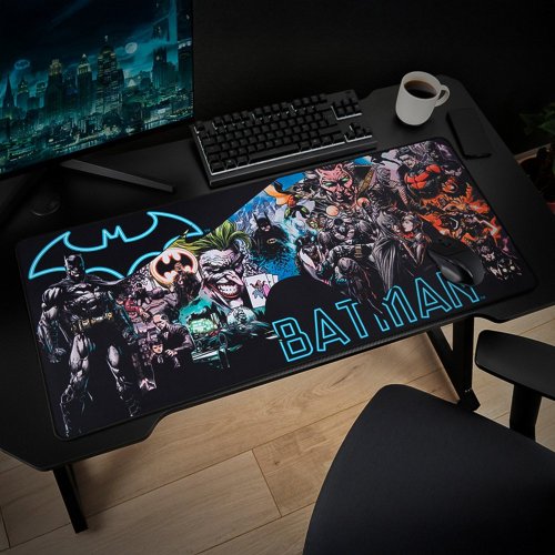 Velká podložka pod myš a klávesnici pro fanoušky populárního superhrdiny z komiksu, Batmana. Vysoce kvalitní tisk odolný proti vodě zaručuje dlouhou životnost a ochranu proti skvrnám a opotřebení. S přilnavým gumovým podkladem je podložka bezpečně přichycena ke stolu, kde zůstává za všech okolností.