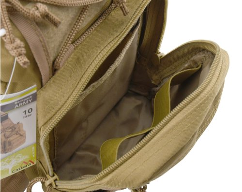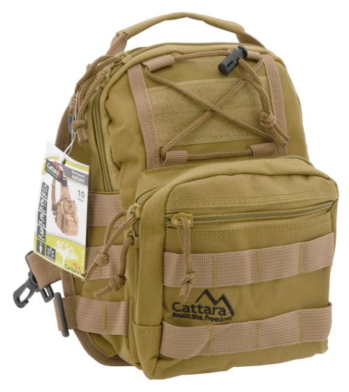 Batoh Cattara ARMY 10 l je skvělou volbou pro uložení veškerého vybavení, které je potřebné na cesty. Tento objemný polstrovaný batoh na rameno ze 100% polyesteru s voděodolnou PVC vrstvou z vnitřní strany je opatřený 1 hlavní, 2 vedlejšími, 3 vnitřními kapsami a 1 zadní prodyšnou kapsou. Z čelní strany a na bocích naleznete Molle systém pro uchycení dalšího vybavení. Kapsy jsou osazeny bytelným 2cestným zipem. Vnitřní kapsy a sítěná kapsa jsou doplněné o poutka pro bezpečné nošení drobných předmětů.