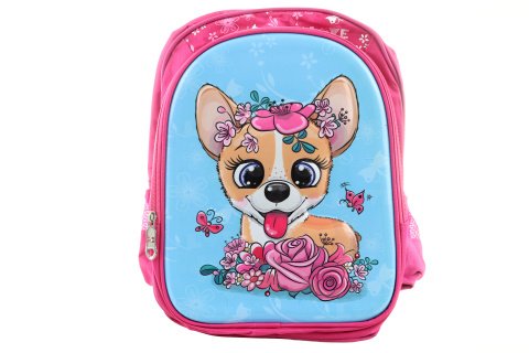 Veselý dětský batoh s motivm roztomilého pejska. Batoh má 2 přihrádky na zip. Z obou stran je také přihrádka na lahev nebo jiné drobnosti. Batoh je pevný a má polstrovaná záda. Nemá hrudní popruh. Rozměry cca 30x35x12 cm. Výrobek není hračka.