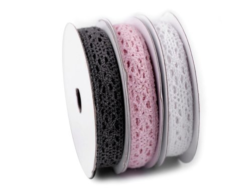 Mix bavlněných krajek oceníte na různé dekorační účely. Použití: Krajky jsou vhodné k olemování polštářů, ubrusů, deček a oděvů. Můžete je také použít jako dekoraci na krabičky, přání k narozeninám či na svatební oznámení. Šíře krajky se po konečné úpravě může lišit o ±6%. V jedné sadě jsou 3 cívky a na každé z nich je krajka s návinem 5 m. Celkem je tedy v jednom balení 15 m. Cena je za 1 cívku/1 ks.[Na 1 cívce se může vyskytovat 1 prostřih.]