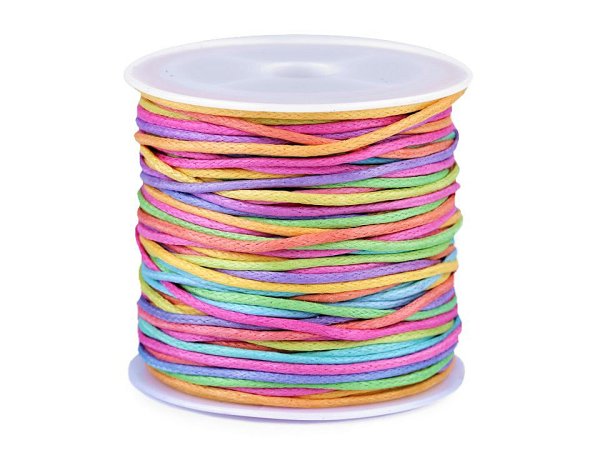 Bavlněná šňůrka s nádherným barevným duhovým přechodem je pevná a hladká. Použití: Šňůra je vhodná jako návlekový materiál při výrobě náhrdelníků a náramků. Díky své jemné tloušťce ji využijete pro náramky tkané technikou macramé (drhané). Můžete ji použít i k výrobě různých dekorací, např. lapačů snů, nebo k originálnímu balení dárků.