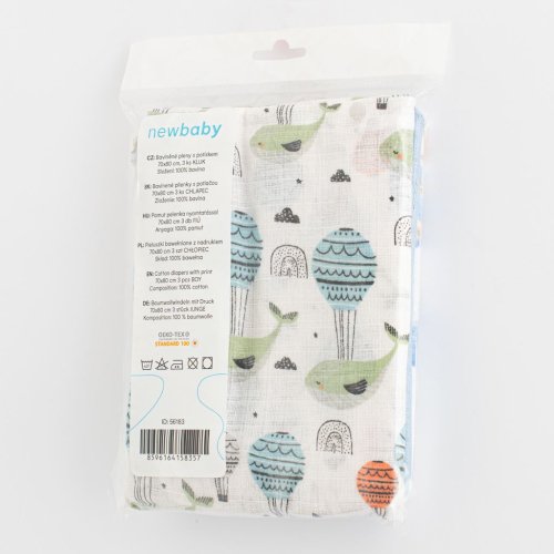 Bavlněné dětské pleny české značky New Baby ve zvýhodněné sadě, jsou nepostradatelnou součástí výbavičky pro miminko. Balení obsahuje 3 ks. Dvě plenky s obrázky a jedna jednobarevná. Vhodně zvolené barvy a obrázky pro chlapečky. Plenky jsou vyrobeny ze 100% bavlny. Jsou hygienické, nezpůsobují alergickou reakci a napomáhají zdravému vývoji kyčelních kloubů u novorozenců. Můžete je využívat nejen pro přebalování ale i pod hlavičku miminka v postýlce či kočárku. Vysoká kvalita zpracování.<BR>Charakteristika:<BR>Rozměry plenky: cca 70x80 cm<BR>Materiál: 100% bavlna<BR>Gramáž materiálu: 120g/m2<BR>Certifikát: OEKO-TEX STANDARD 100