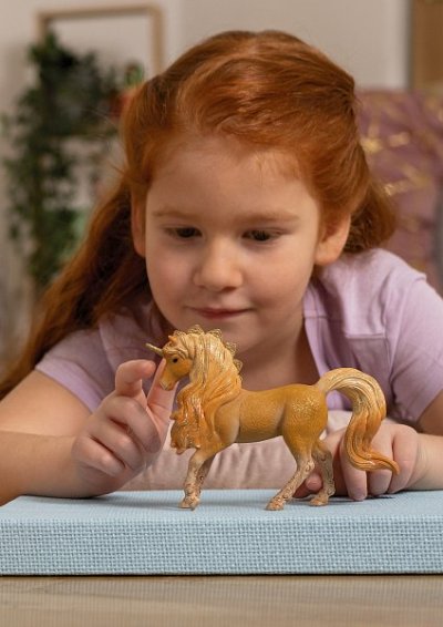 Hrdý hřebec jednorožce Apollo představuje udržitelnou solární energii. Není divu, protože se svou zlatohnědou srstí a zlatým zoubkovaným hřebenem na krku září jako slunce. Netrpělivě švihá svým bujným kudrnatým ocasem sem a tam a klape kopýtky: Kde jsou klisna jednorožce Flowy a hříbě jednorožce Stormy? Chtěli společně vyrazit na rodinný výlet a prozkoumat krásný svět BAYALA®. Ale možná mu bude dělat společnost někdo jiný? Rozměry balení: 11,8 x 16,4 x 3,9 cm. Věk: 5+