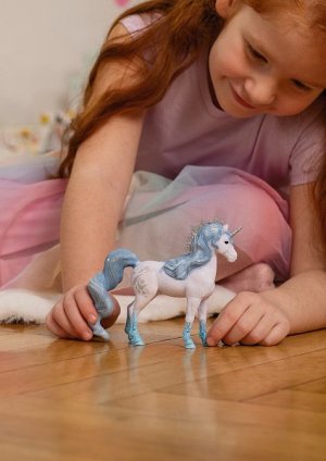 Když klisna jednorožce Flowy klusá po louce, všichni se za ní otáčejí. Vypadá nádherně. Její splývavý modrý ocas vypadá jako vodopád a bujná třpytivá hříva se jí elegantně vine po hřbetě. Všechno na tomto nádherném jednorožci připomíná vodu. Možná právě proto je tahle krásná klisna dokonalým symbolem vodní energie? Vždycky bude ráda bránit svět BAYALA®, který je šetrný ke klimatu. Rozměry figurky: 11,7 x 14,4 x 4 cm. Věk: 5+