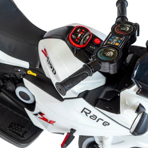Dětská elektrická motorka Rare Baby Mix je vybavena baterií 6V7AH a dvěma motory s výkonem 380. Disponuje funkcí jednoduchého startu na jedno tlačítko, která umožňuje jízdu vpřed i vzad. Motorka je vybavena hudbou, písničkami pro děti, kartou pro čtení dat pro rané vzdělávání, třemi koly a LED světlomety. Komfort zajišťuje kožené sedadlo.