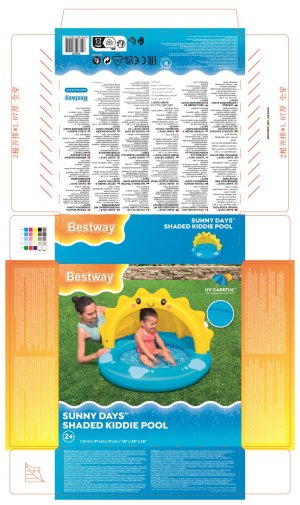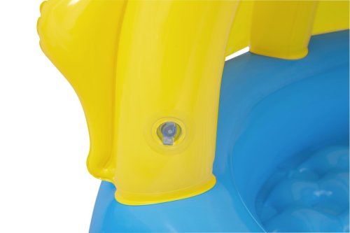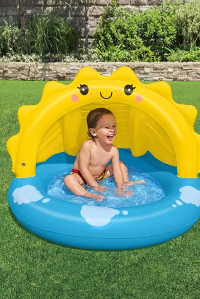 Výrazným prvkem je žlutá nafukovací stříška ve tvaru usměvavého sluníčka s roztomilými tvářemi, která slouží jako ochrana proti přímému slunečnímu záření. Stříška je pevně připevněna k bazénu a zajišťuje tak stín a bezpečí během hravých chvil na čerstvém vzduchu. Tento prvek je nejen funkční, ale i estetický, čímž zvyšuje atraktivitu bazénu pro děti i rodiče.