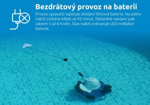 Velkou výhodou vysavače je jeho bezdrátový provoz. Dobíjecí lithiová baterie zvládne pracovat na jedno nabití až 45 minut. Na její stav vás upozorní praktický LED indikátor. Následné nabíjení trvá zhruba 5 až 6 hodin.