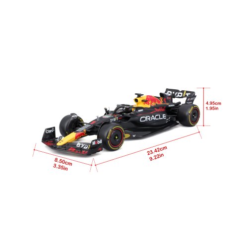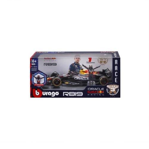 Bburago modely závodních vozů Formule 1 v měřítku 1:24 z kolekce RACE jsou sbírkou krásného designu s vysokým důrazem na přesnost detailů. Součástí modelů je plastová figurka jezdce F1 v mistrovské póze. Modely F1 ze stáje Oracle Red Bull Racing RB19 (2023) jsou vyrobeny z litého kovu s plastovými detaily. Každý z modelů je v klasickém závodním designu a se závodním číslem. Baleno v krabičce. Nevhodné pro děti do 3 let. Rozměry balení: 12,7 x 28 x 12,7 cm. Věk: 14+