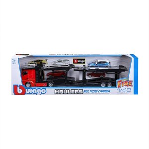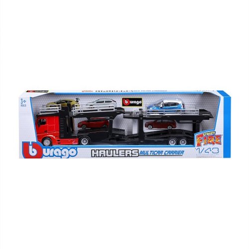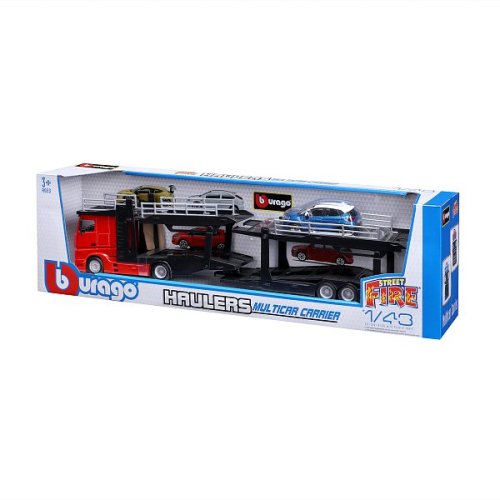 Modely kamionů v měřítku1:43 Multicar Carrier s návěsem pro přepravu aut z kolekce Street Fire jsou sbírkou modelů s vysokým důrazem na přesnost detailů. Modely jsou vyrobeny z litého kovu s plastovými detaily. Každý z kamionů je doplněn jedním modelem osobního automobilu. V přepravním návěsu mohou malí řidiči převážet až pět autíček z kolekce Street Fire. Baleno v krabičce. Nevhodné pro děti do 3 let. Rozměry balení: 15,5 x 52,1 x 11,8 cm. Věk: 3+