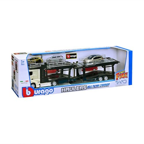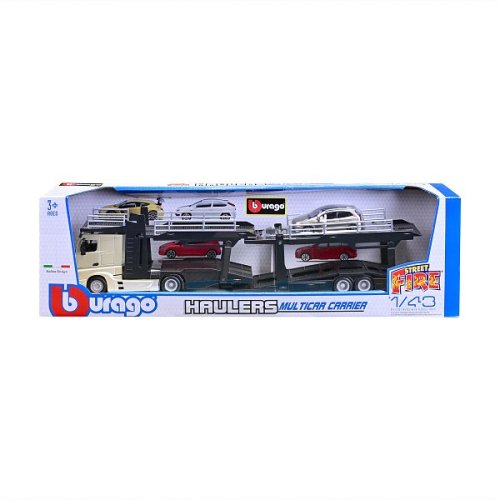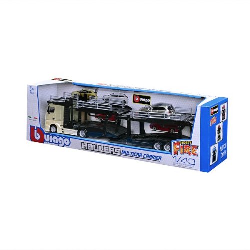Modely kamionů v měřítku1:43 Multicar Carrier s návěsem pro přepravu aut z kolekce Street Fire jsou sbírkou modelů s vysokým důrazem na přesnost detailů. Modely jsou vyrobeny z litého kovu s plastovými detaily. Každý z kamionů je doplněn jedním modelem osobního automobilu. V přepravním návěsu mohou malí řidiči převážet až pět autíček z kolekce Street Fire. Baleno v krabičce. Nevhodné pro děti do 3 let. Rozměry balení: 15,5 x 52,1 x 11,8 cm. Věk: 3+