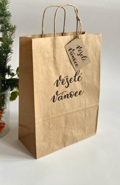 Be Nice dárková taška se jmenovkou. Jste praktičtí a nechcete na balení dárků spotřebovat velké množství papíru? Jednoduše je vložte do dárkové tašky s vánočním textem a jmenovkou. Obdarovaný díky tomu bude mít všechny dárky na jednom místě. A vánoční bonus nakonec: taška je vyrobena z přírodního hnědého papíru, doplněna hezkou jmenovkou a můžete ji použít opakovaně. Potisk Veselé Vánoce napsala česká ilustrátorka Bára z Nikolajky.
