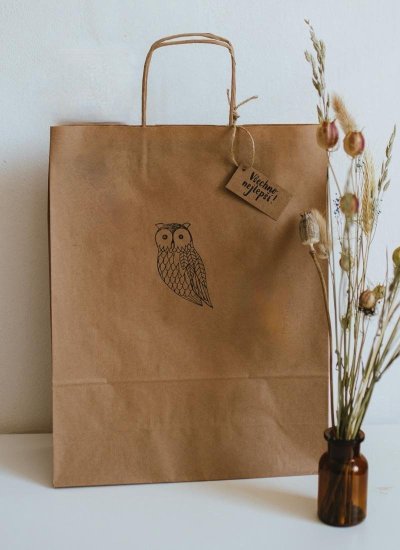 Be Nice přírodní dárková taška s motivem sovičky a ozdobnou jmenovkou. Rozměry 32 x 41 cm