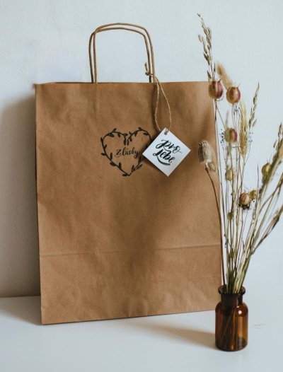 Be Nice přírodní dárková taška "Z lásky" se jmenovkou "Pro tebe". Rozměry 32 x 41 cm