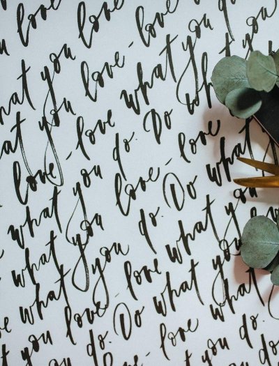 Be Nice EKO balicí papír písmo s citátem do what you love - love what you do na bílém papíru. Originální motivy vytvořila česká ilustrátorka Bára z Nikolajky.