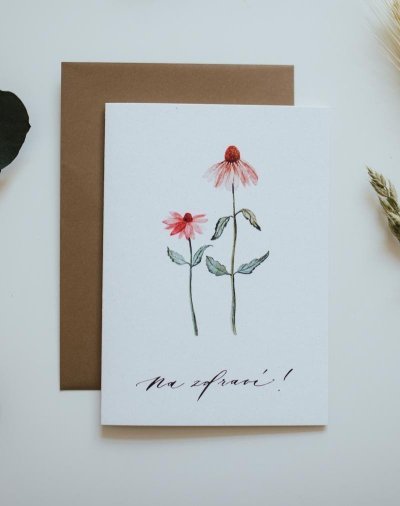 Be Nice ekologické přání Na zdraví - s originálním designem české bylinky echinacea. Přání ilustrovala česká výtvarnice Bára z Nikolajky. Rozměr: 12 x 17 cm