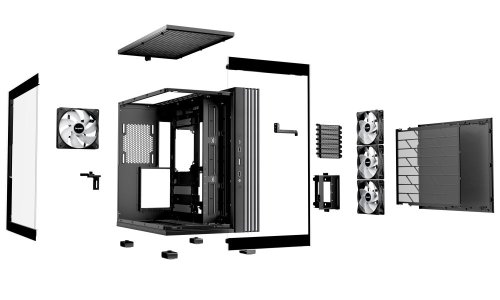Unikátní počítačová skříň s průhlednou bočnicí i předním panelem formátu Middle Tower nabízí dostatek prostoru pro montáž většiny dostupných komponent. Hlavní předností této skříně je možnost rychlé změny její orientace díky systému odnímatelných a přemístitelných nožiček. Skříň je dodávána se čtyřmi předinstalovanými 120mm ventilátory s ARGB podsvícením. K tomu nabízí dalších až 6 pozic pro ventilátory a dva integrované rozbočovače ventilátorů a ARGB. Na předním panelu se nachází dva porty USB 3.0, jeden port USB-C, sluchátkový výstup a audio vstup pro mikrofon. Herní design ještě doplňuje elegantní ARGB osvětlení lemující strany skříně, díky čemuž je viditelné bez ohledu na to, v jaké orientaci skříň používáte. Ve skříni je dostatek prostoru pro chladič CPU do výšky až 170 mm a grafickou kartu o délce až 400 mm. Důmyslné řešení umožňuje pohodlné umístění až 360 mm dlouhého výměníku vodního chlazení na horní nebo spodní straně. Potěší také přítomnost prachových filtrů či integrovaná podpěra grafické karty. Skříň je dodávána bez zdroje.