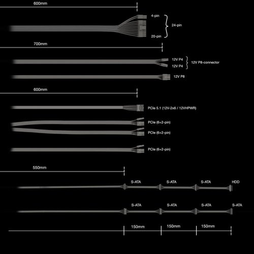 Napájecí konektory: 1× ATX 20+4pin, 1× PCIe 5.1 (600 W), 1× EPS 4+4pin, 1× EPS 8pin, 3× PCIe 6+2pin, 7× SATA, 1× Molex