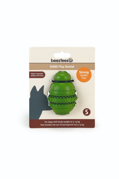 V otvoru ve spodní části Sumo Play Dental můžete schovat chutný pamlsek a Váš pejsek se bude snažit ze všech sil, aby se k němu dostal, což je skvělý způsob, jak zabránit tomu, aby trpěl nudou. Je to ideální hračka, se kterou si Váš mazlíček může hrát nejen, když je sám. Je opatřena drážkami, které podporují péči o zuby, žebrovaný povrch masíruje dásně a pomáhá proti zubnímu kameni a plaku. Praktickou výhodou je možnost mytí v myčce nádobí. Zelená barva. Velikost: 6 x 6 x 8.5 cm, vhodná pro psy o hmotnosti cca 3-15 kg.