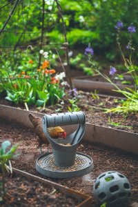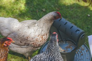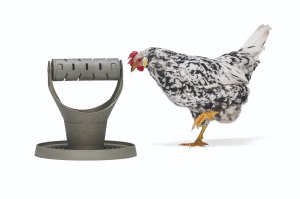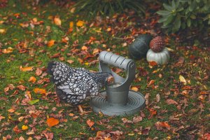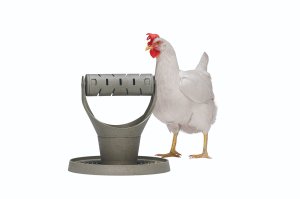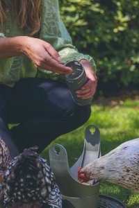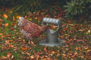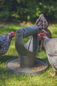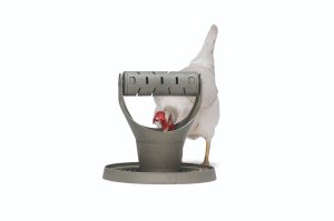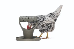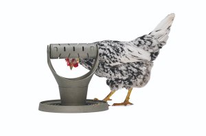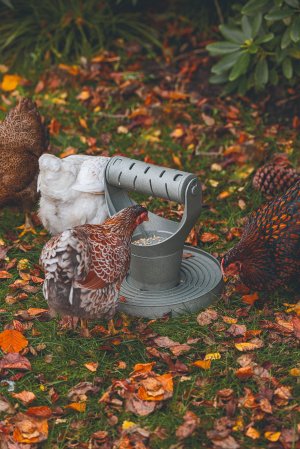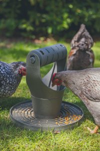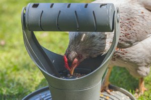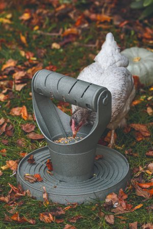 Krmicí věž nabízí kuřatům a slepicím i zábavnou výzvu v podobě otáčivého válce, který lze naplnit krmivem. Pokud do něj správně klovnou, budou okamžitě odměněny.