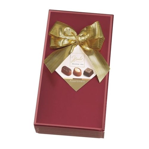 Elegantní belgické pralinky v dárkovém vínovém obalu se zlatou mašlí