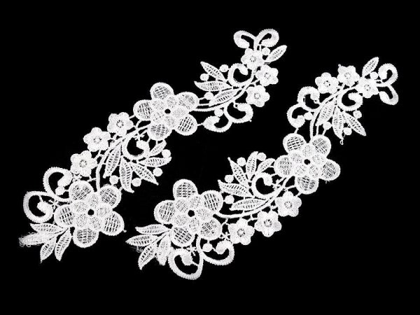Květinová vsadka působí elegantně.[ Skládá se ze 2 dílů (levý a pravý díl).] Vynikne na halenkách, [spodním prádle], riflích, atd. Je vhodná také na ozdobení bytového textilu např. polštářů nebo kabelek.