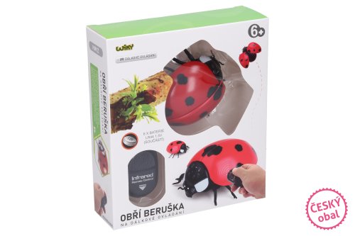 Obří beruška na dálkové ovládání. Velikost 9 x 9 cm. Infračervený port. Ovládání - dopředu, couvání doprava, demo. Výdrž až 20 min, dosah 10 m. Beruška - 3 x LR44 baterie součástí, ovladač - 3xLR44 baterie, součástí.