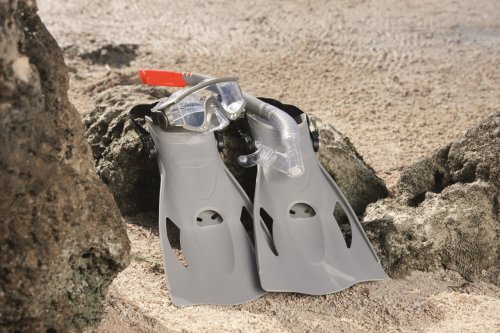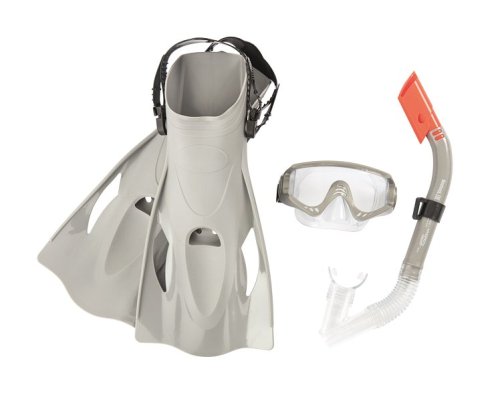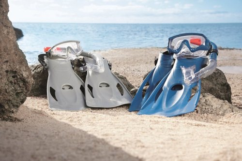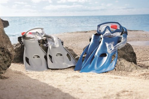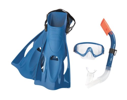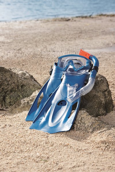 Šnorchlovací set-ploutve, brýle, šnorchl ve dvou barevných provedeních (šedá/modrá). Čočky brýlí jsou v bezpečně tvarované s UV ochranným filtrem. Měkký, přilnavý okraj je neprodyšný. Plně nastavitelný řemínek na velikost hlavy. Naústek na šnorchl na míru. Technologie Dry Top je speciální vylepšení šnorchlu, které zabraňuje průniku vody do úst. Měkké, komfortní ploutve lze pomocí patního pásku nastavit ve velikostech EUR 41-46. 100% bez latexu. 2 různé barvy. Taška se štítkem. Věk: 14+.