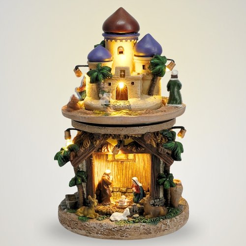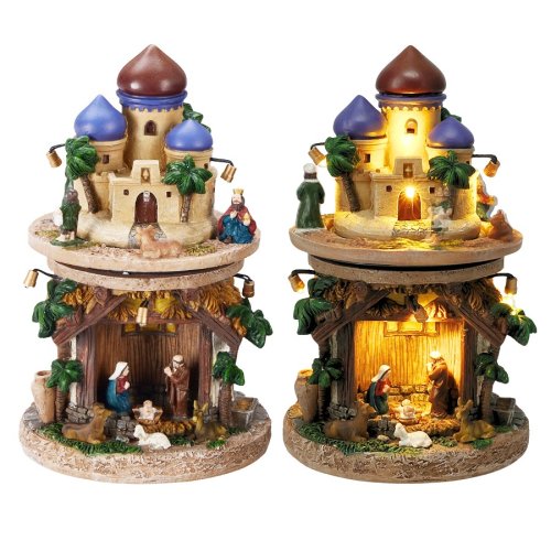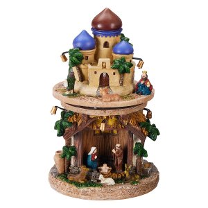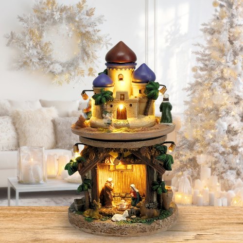 Interaktivní betlém z polyresinu přináší kouzelnou atmosféru Vánoc díky LED osvětlení, hudbě a otočné kulisové scéně. Ideální jako dekorace na stůl nebo poličku, přináší radost dětem i dospělým.