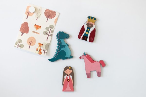 Dřevěné magnetky král, princezna, princ, drak a jednorožec se budou vyjímat na lednici, tabuli nebo jakémkoliv jiném magnetickém povrchu. Jsou vyrobeny z topolového dřeva, pomalovány barvami nezávadnými pro děti a mají certifikaci CE, což zaručuje bezpečnost a vhodnost pro použití dětmi od tří let. Hlavní vlastnosti: hezká dekorace vyrobeno z topolového dřevapoužity barvy bezpečné pro děticertifikace CE
