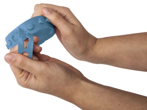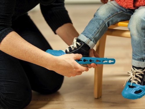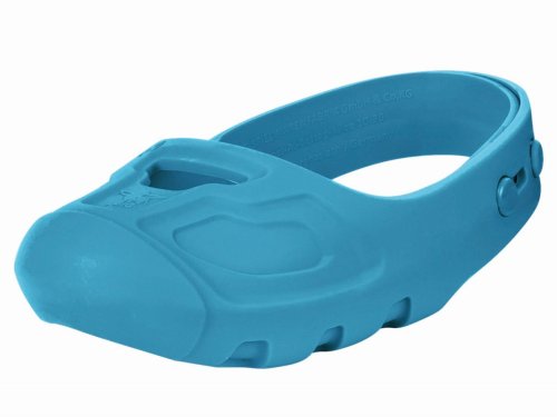 Ochranné návleky na botičky v modré barvě pro jízdu např. na odrážedle, cyklokole apod. Nezanechávají stopy na podlaze, protiskluzová úprava. Snadno nastavitelná velikost pomocí háčků a oček. Vhodné pro dětskou obuv velikosti 21-27.