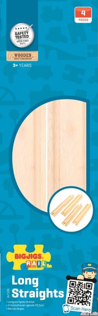 Toto balení obsahuje 4 dlouhé rovné koleje z BigJigs železničního sortimentu. Jsou vyrobeny z kvalitního tvrdého dřeva, jsou také kompatibilní s dalšími dřevěnými vláčkodráhami a tím se stanou skvělým přírustkem do vaší sbírky dřevěných železnic. Hlavní vlastnosti: vláčkodráhy a jejich příslušenství značky Bigjigs Rail je možno kombinovat se všemi dalšími dřevěnými vláčkodráhami na trhuvyrobeno z kvalitních a zodpovědně získaných přírodních materiálůodpovídá současným evropským bezpečnostním normámpodporuje představivost, obratnost a koordinaci