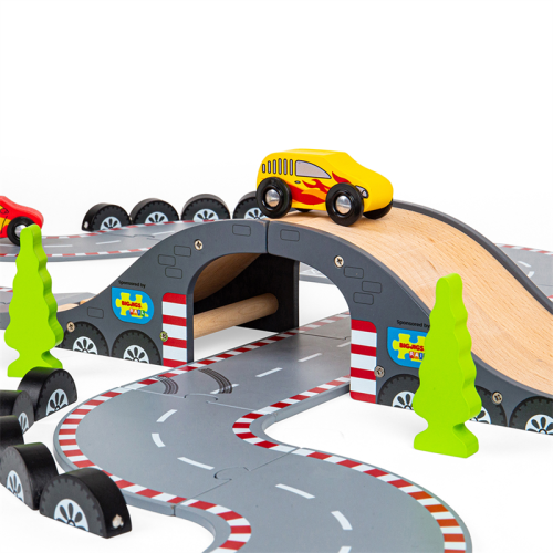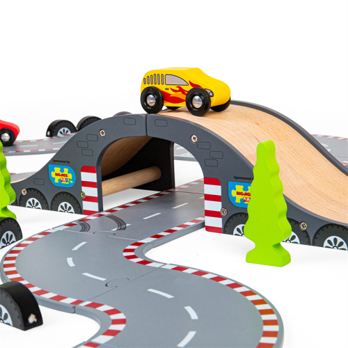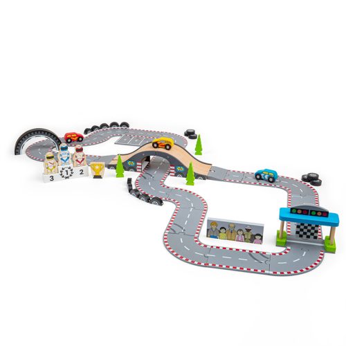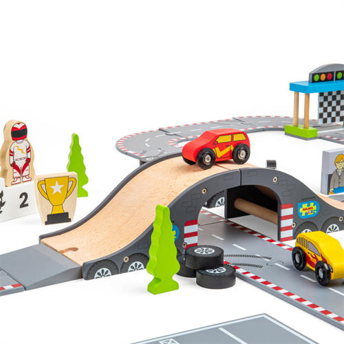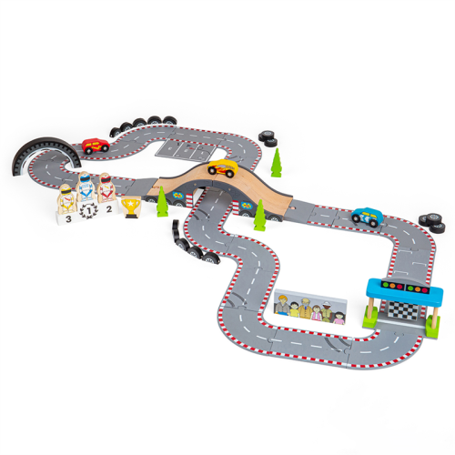Připravit! Pozor! Start! Tato fantastická dřevěná autodráha Závodní den je ideální dárek pro každého malého závodníka, nebo závodnici. Obsahuje řadu dřevěných silníčních dílů, 3 závodní auta, start/cíl a další příslušenství, což umožňuje dostatek prostoru pro zábavnou a kreativní hru. Lze ji použít s dalšími sadami Bigjigs Rail silnicemi a rozšířit tak rozmanitost herních aktivit. Lze kombinovat i se všemi ostatními dřevěnými silničními sadami na trhu. Rozvíjí koordinaci pohybů, jemnou motoriku, zručnost a představivost. Vyrobeno z vysoce kvalitních, zodpovědně získaných materiálů. Splňuje aktuální evropské bezpečnostní normy. Hlavní vlastnosti: 47 dílná dřevěná závodní dráhaobsahuje 3 závodní auta, 3 jezdce, pódium pro vítěze, hlavní tribunu, bariéry, semafory stromečky, pohár pro vítěze, nadjezd a díly závodní traťepodporuje představivost, obratnost a koordinacivhodné od 3 let