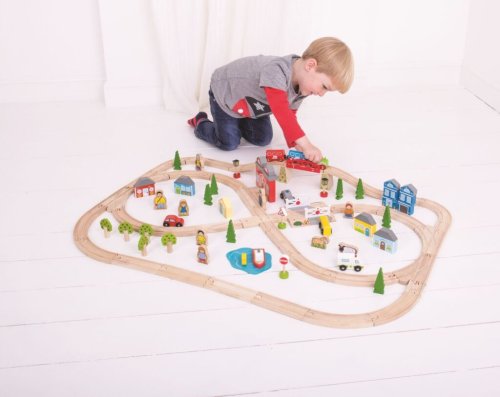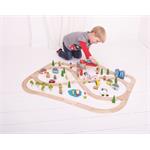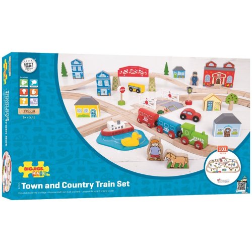 Sada obsahuje 91 kusů. Vláček jezdí přes město, přes most a ven do přírody, projíždí mezi stromy, domy a kolem kostela. Mezitím musí auta trpělivě čekat na vlakovém přejezdu, aby stihl vláček dorazit na nádraží přesně na čas.Hlavní vlastnosti: vláčkodráhy a jejich příslušenství značky Bigjigs Rail je možno kombinovat se všemi dalšími dřevěnými vláčkodráhami na trhuvyrobeno z kvalitních a zodpovědně získaných přírodních materiálůodpovídá současným evropským bezpečnostním normámpodporuje představivost, obratnost a koordinaci