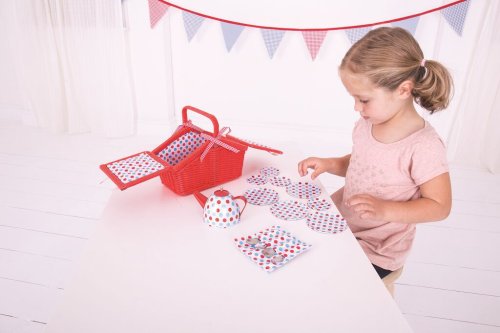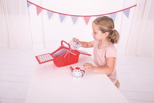 Tato nádherná puntíkovaná čajová souprava obsahuje červený proutěný koš, ve kterém najdete čtyři šálky, čtyři talířky, čajovou konvici s odnímatelným víkem a čtyři lžičky v obalu. Sada obsahuje vše, co děti potřebují k čajovému dýchanku. Hlavní vlastnosti: vhodné i na cestyskvělý způsob, jak povzbudit kreativitu a nápadyodpovídá současným evropským bezpečnostním normám