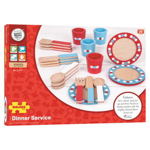 Začínající mladí kuchaři mohou nachystat vlastní večeři a uspořádat čajové dýchánky s touto barevnou dřevěnou jídelní sadou. Set je dodáván se 4 dřevěnými talíři, hrnky, noži, vidličkami a lžícemi, což z ní dělá skvělý doplněk do každé dřevěné kuchyňky na hraní. Dřevěná sada nádobí Bigjigs Toys, která nabízí hodiny zábavy a nekonečné herní možnosti, je skvělým způsobem, jak podpořit nápaditost a kreativitu. Vyrobeno z vysoce kvalitních, zodpovědně získaných materiálů. Splňuje aktuální evropské bezpečnostní normy. Hlavní vlastnosti: jídelní servis s puntíky v jemných barvách20 kusů nádobíideální doplněk do dětské kuchyňkypodporuje kreativitu a nápaditost