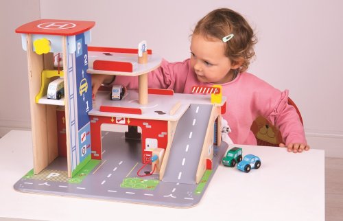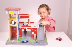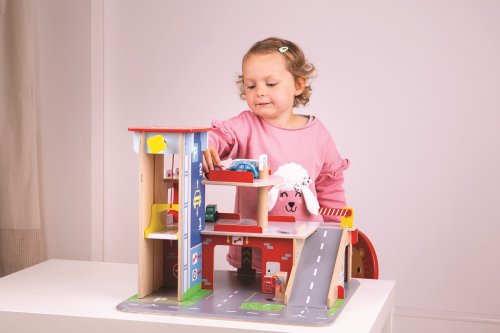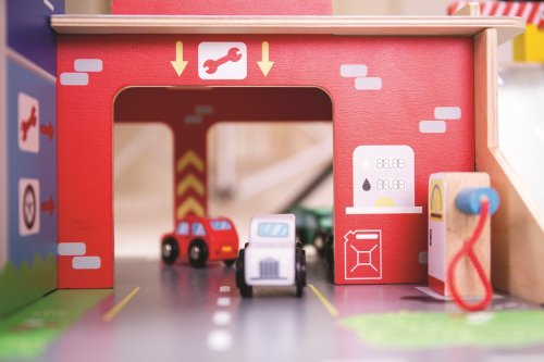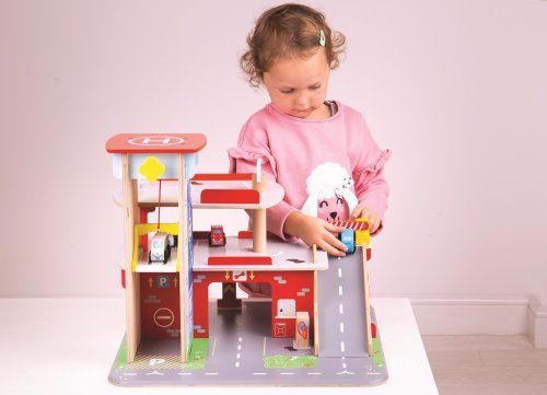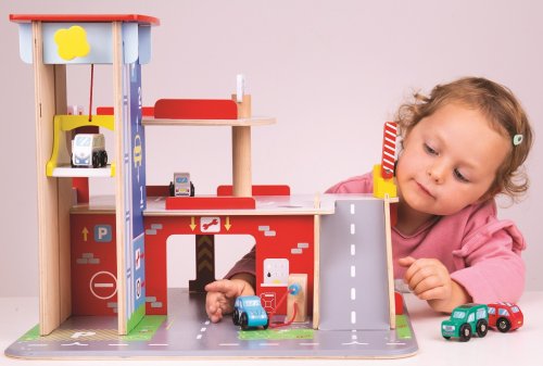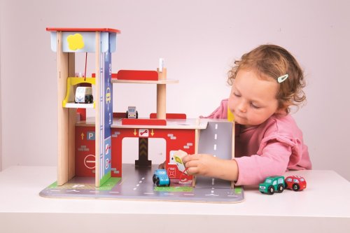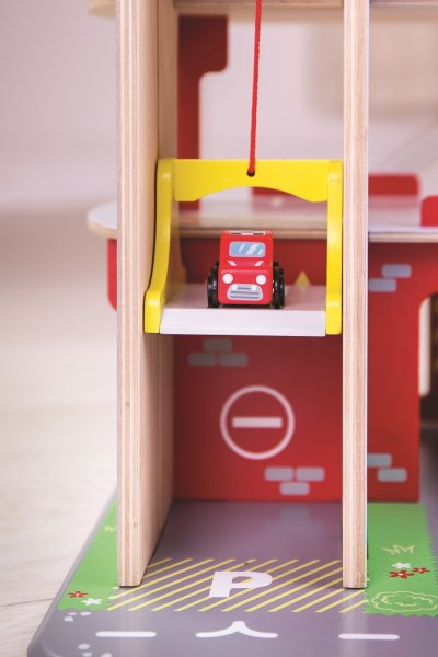Děti si užijí hru plnou zábavy na každém ze tří pater garáže s parkovištěm. V přízemí mohou autem vjet na fungující výtah a poté vyjet až do druhého patra a zaparkovat. V přízemí děti najdou servis, myčku i pumpu. Z prvního patra mohou auta odjíždět za pomocí výtahu nebo po rampě, ale pozor, auta musí počkat na zvednutí závory! Nejvyšším bodem garáže je heliport. Tato garáž má prostě vše, co malý řidič potřebuje pro dopravení se z bodu A do bodu B. Podporuje kreativitu a představivost. Vyvíjí koordinaci ruka-oko, jemnou motoriku a zručnost. Možno doplnit autíčky Bigjigs Toys a Bigjigs Rail. Vyrobeno z kvalitních materiálů z odpovědných zdrojů. Hlavní vlastnosti: 3 patra s parkovištěm a heliportemfunkční výtahservis, myčka i pumpa v přízemí
