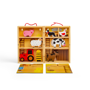 Přenosná krabička stylizovaná jako farma, kterou sebou můžete vzít kamkoli. Děti od 18 měsíců můžou pomocí této hračky objevovat každodenní povinosti farmáře. Podporuje kreativitu a představivost. Hladké robustní hrací figurky mají ideální velikost pro malé ručičky k uchopení, zkoumání a výměně. Hlavní vlastnosti: přenosnost, ideální na cestovánívyrobeno ze dřevamasivní dřevěná zvířátka - kůň, kráva, pes, prase a ovceobsahuje hrací krabici, rozkládající hrací podložku, zvířátka, včelí úl a traktorvhodné od 18 měsíců