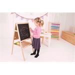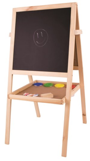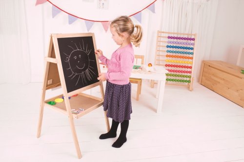 S touto všestrannou tabulí lze snadno rozvíjet kreativní umělecké dovednosti dětí. Z jedné strany magnetická tabule se suchým stíráním fixů, z druhé strany tradiční tabule pro křídu. Součástí je role papíru, kterou lze snadno upevnit na tyč skrytou mezi tabulemi v jejich horní části, dále čtyři nádobky na barvy, guma a 12 barevných kříd. Hlavní vlastnosti: včetně příslušenstvívyrobeno z kvalitních zodpovědně nakupovaných materiálůvyhovuje současným evropským bezpečnostním normám
