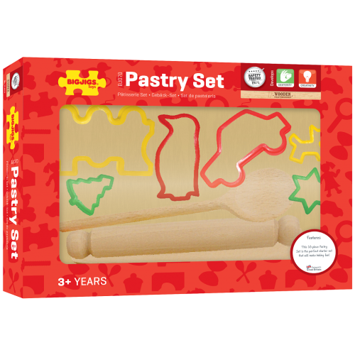 Ideální sada pro zábavu při pečení! Obsahuje vařečku, stěrku, prkénko a váleček. Dodáváno se šesti pestrobarevnými vykrajovátky na pečivo, včetně hvězdy, auta, psa, vánočního stromku, vláčku a tučňáka. Splňuje aktuální evropské bezpečnostní normy. Skládá se z 10 dílů. Hlavní vlastnosti: obsahuje 10 dílůpodporuje kreativitu a tvůrčí činnost